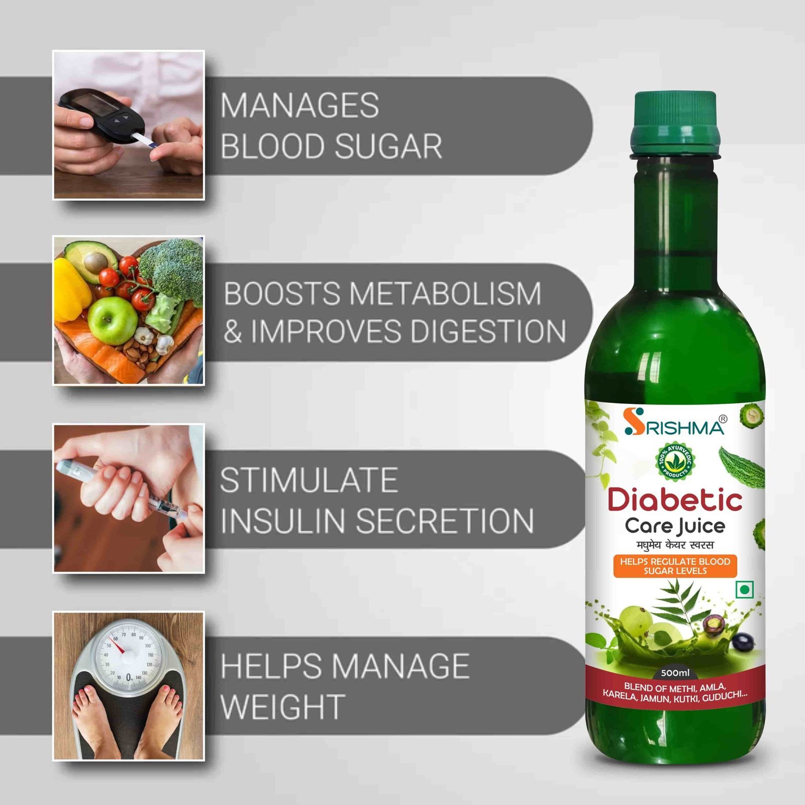 Srishma Diabetic Care juice is a 100% Ayurvedic juice made from natural herbs that help regulate blood sugar levels, boost metabolism, and improve digestion.